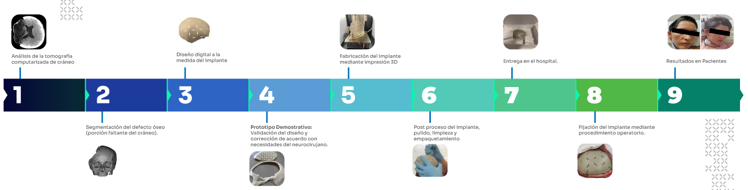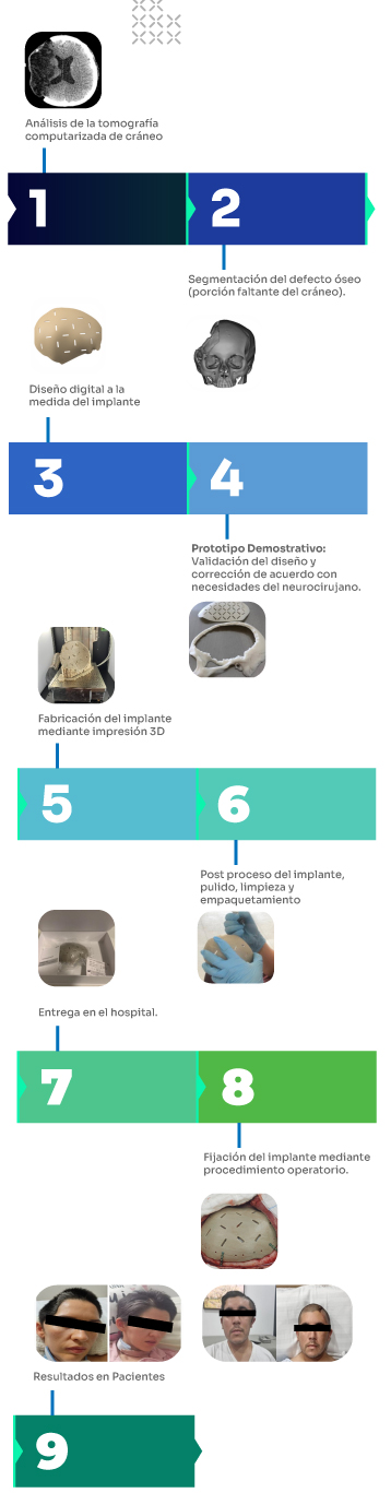 Implantes personalizados utilizando la avanzada tecnología de impresión 3D. Diseñados específicamente para adaptarse a las necesidades del paciente y las exigencias del neurocirujano, garantizando una precisión milimétrica en la reconstrucción anatómica del cráneo.